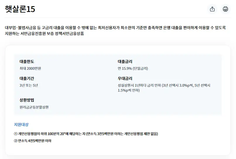 불법 사금융이나 고금리 대출은 피하시고, 안전한 정부 지원 상품을 활용하시기 바랍니다. 자세한 내용은 서민금융진흥원 홈페이지나 시중 금융사 창구에서 확인하실 수 있습니다.